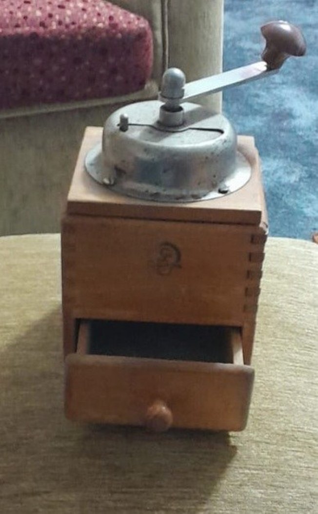 Ahşap gövdeli klasik kahve değirmeni, üstte metal el krankı ve öğütülen kahveyi toplamak için küçük çekmecesi vardır. ☕BİZ KARABİBER ÖĞÜTMEK İÇİN KULLANDIK YIKANIP KAHVE ÖĞÜTÜLEBİLİR