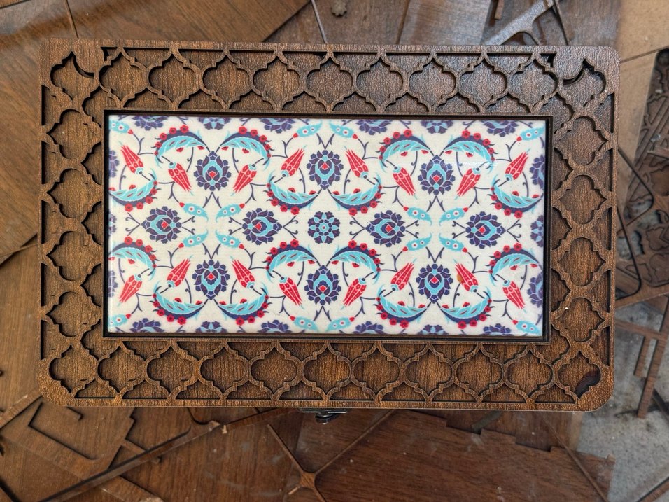 CNC kesimli 7.5 x 15 cm ebatında el yapımı çini motifli içi süngerli ahşap kutu. İster takı kutusu,ister bozuk para kutusu istersen kartvizit kutusu olarak kullanıma uygun