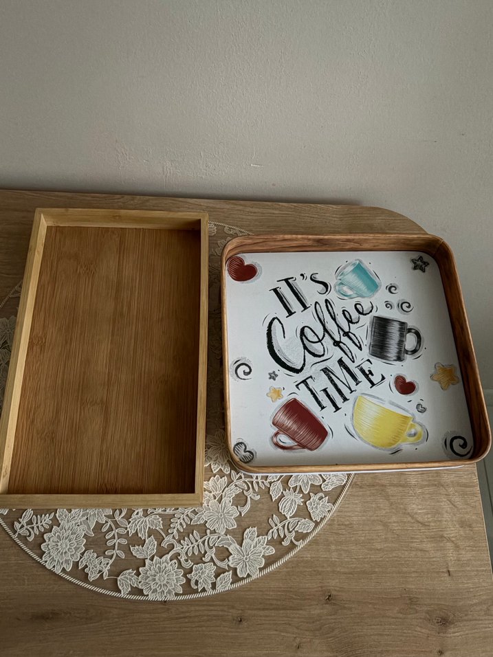 Açılabilir kapağa sahip açık kahverengi ahşap tepsi, üzerinde renkli kahve fincanları ve "It's Coffee Time" yazısı bulunan kare tabak içerir. ☕
