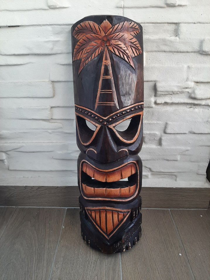 15x50 cm ölçüsünde Detaylı oyma ve palmiye ağacı figürlü ahşap tiki maskesi, dekorasyon için uygundur.