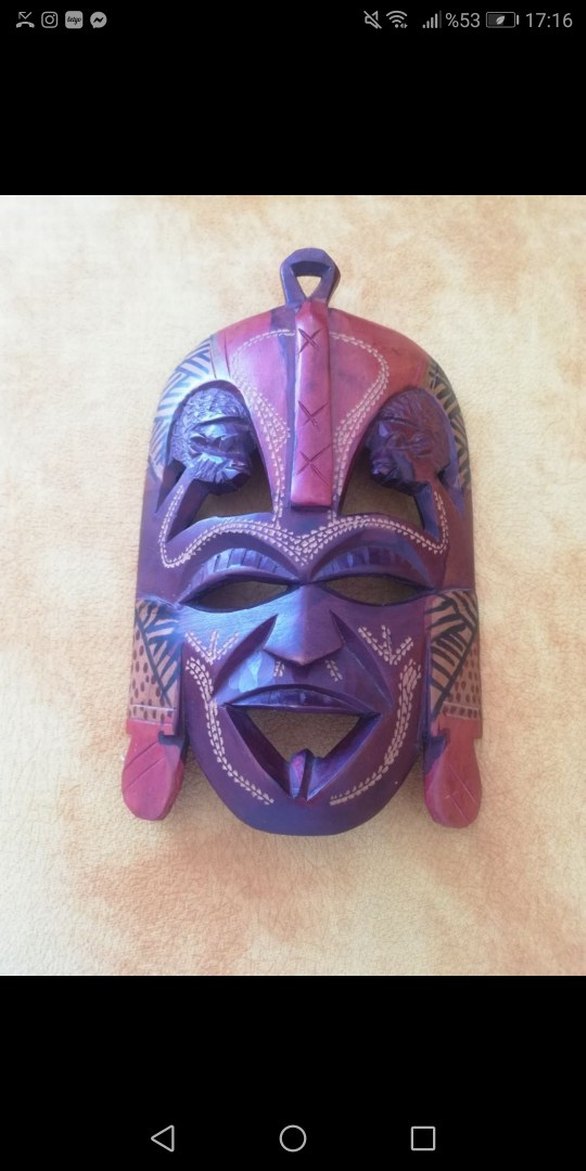 Mor ve kırmızı tonlarda boyanmış, oyma detaylı tribal desenli ve figürlü ahşap erkek maskesi. Asmak için halkası bulunur.