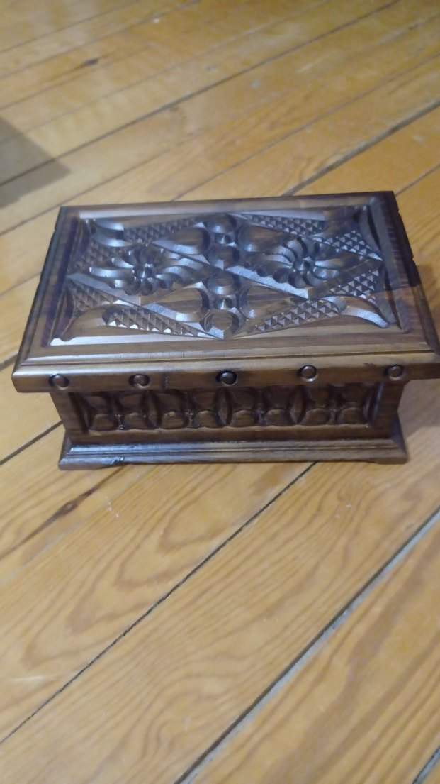 Koyu kahverengi ahşap takı kutusu, kapak ve yanlarında detaylı oyma desenlere sahiptir.