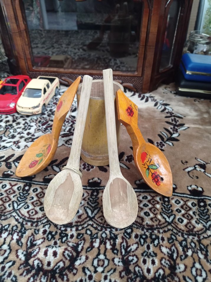 Oyma ve boyama süslemeli, açık ve beyaz tonlarda ahşap kaşık seti. Rustik, el yapımı görünümü vardır. ️