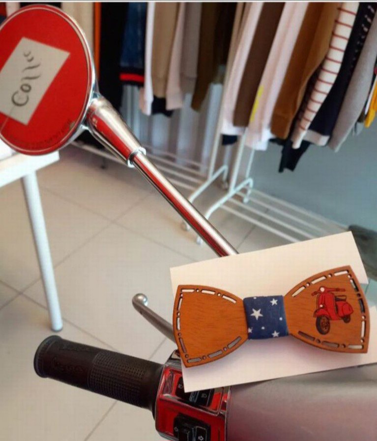 Ahşaptan, el işçiliğiyle özel olarak yapılmış papyon,mavi yıldız desenli,düz yeşil, düz kırmızı gibi renkli kumaslardan yapılmış ortasıyla klasik papyon şeklini eğlenceli detaylarla buluşturuyor. Üzerindeki Vespa motifi el boyamasidir.️