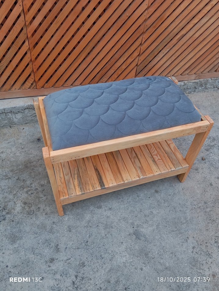 Yumuşak minderli üst kısmı ve alt raflı ahşap çerçevesi olan ahşap puf Konforlu ve kullanışlıdır. vernikli üründür ölçüleri 35/70 yükseklik 45 cm dir