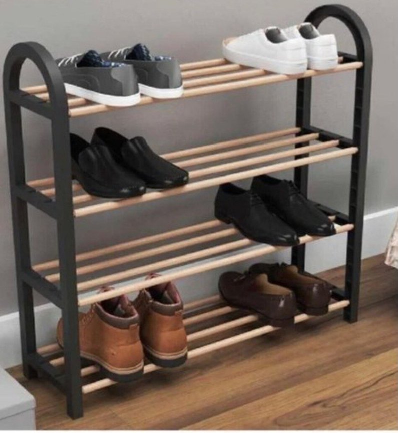 siyah çerçeve ve kahverengi ahşap raflara sahip çok katlı ayakkabı düzenleyici. Ayakkabılarınızı düzenli ve erişilebilir tutar.
