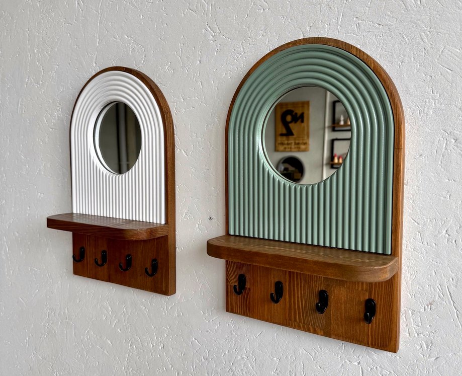 42.25.8 cm ölçüsünde ahşap, aynalı, raflı duvar anahtarlığı. Yeşil ve beyaz seçenekleri mevcuttur. Hangi rengi seçtiğinizi mesajla belirtiniz.