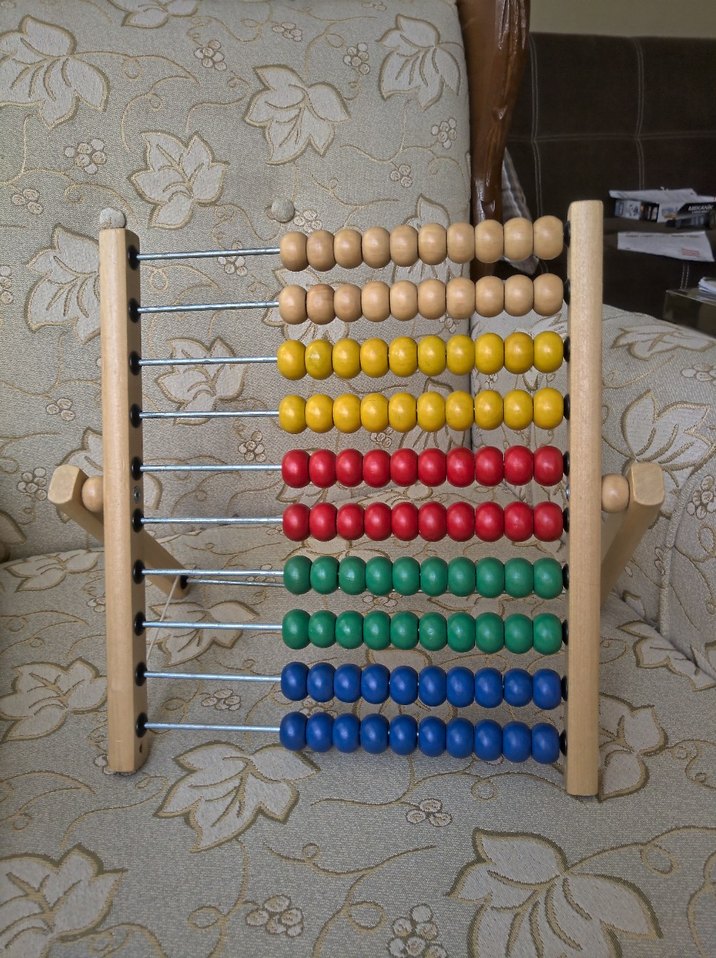 Doğal, sarı, kırmızı, yeşil ve mavi renkli boncuklarıyla ahşap abaküs eğitici oyuncak. Saymayı öğrenmek için uygundur.
