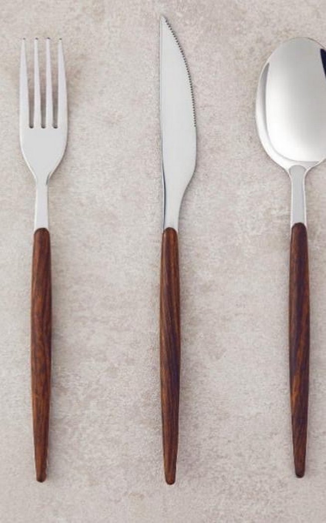 English home. Ahşap saplı çatal, bıçak ve kaşıktan oluşan paslanmaz çelik set. Doğal ahşap ve parlak metal uyumu sağlar.