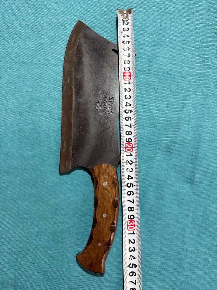 Koyu renkli büyük bir mutfak satırı, ahşap sapı perçinlerle sağlamlaştırılmıştır. Uzunluğu ölçülmüştür. 5 mm kalınlık ceviz sap cilalı Sivas yapımı kaliteli satır
