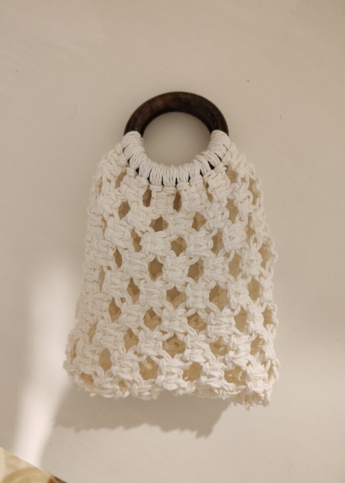 ahşap saplı hasır ipten makrome el çantası