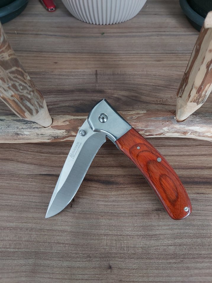 Keskin gri bıçağı ve kahverengi ahşap sapı olan katlanır bıçak, dayanıklılığı klasik tasarımla birleştirir.