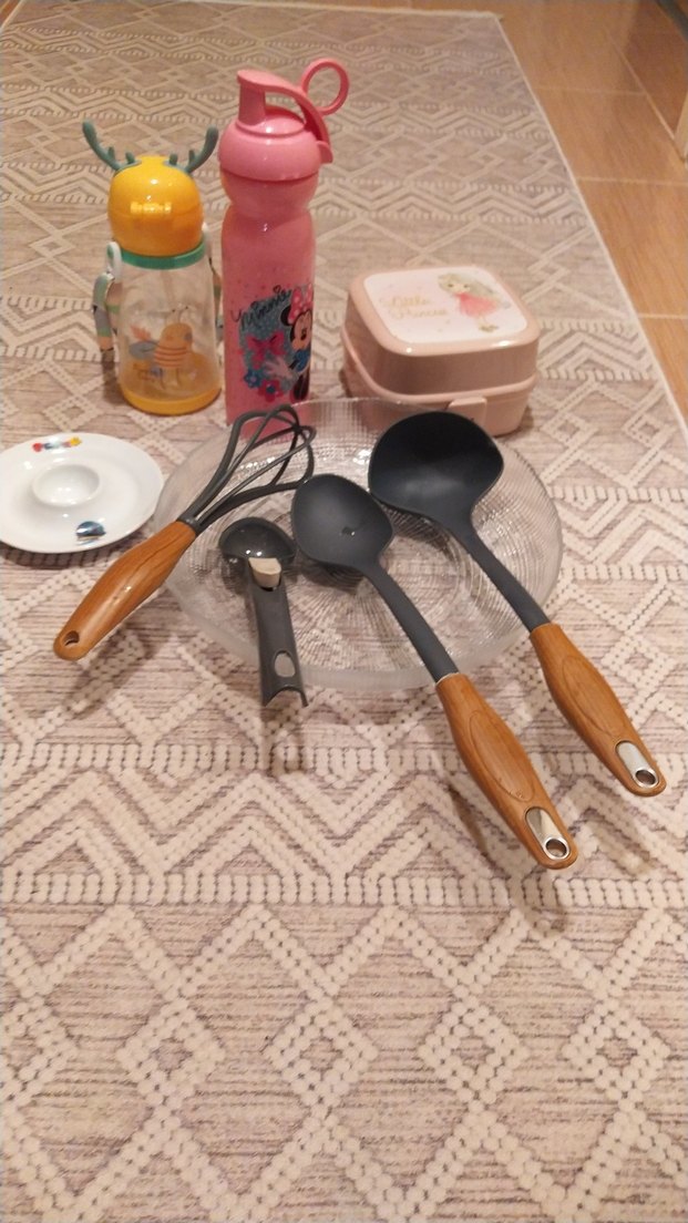 Ahşap saplı karıştırıcı, kepçe, delikli kaşık ve konserve açıcıdan oluşan koyu kahverengi mutfak gereçleri seti.