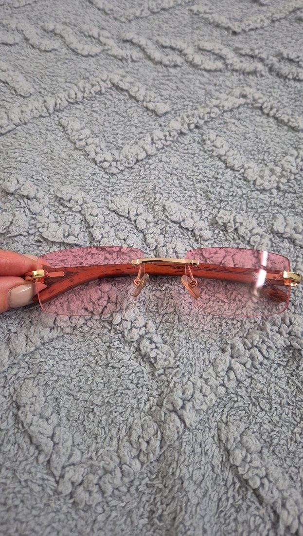 Pembe, ahşap saplı kadın güneş gözlüğü.
