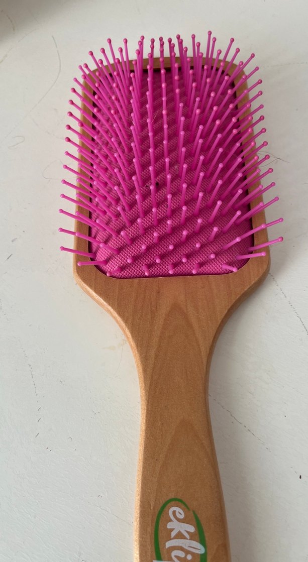 Ahşap saplı, pembe yumuşak kıllara sahip geniş yüzeyli saç fırçası, saçları nazikçe açmak için uygundur.