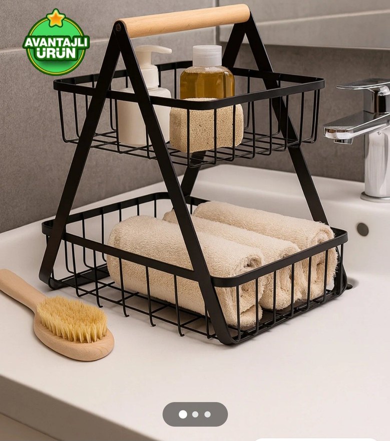 Ahşap saplı, siyah metalden yapılmış iki katlı makyaj organizeri. Kozmetik ve kişisel bakım ürünlerini düzenlemek için uygundur.