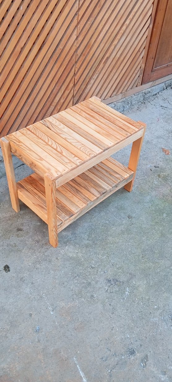 Bej parlak ahşap malzemeden yapılmış, iki katlı basit ve sağlam sedir oturak yada raf olarak da kullanılabilir Desensiz tasarımı fonksiyonelliği artırır. ölçüleri 35/60 yükseklik 45 cm dir