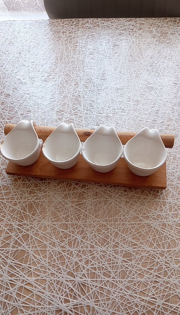 Ahşap stand üzerinde yer alan 4 adet beyaz sosluk seti, mutfakta sos ve baharat sunumu için uygundur. ️