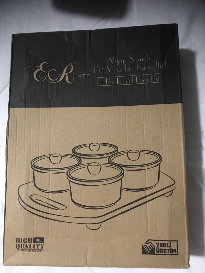 Ahşap stand üzerinde yer alan, kapaklı dört adet yuvarlak kahvaltılık kap içerir. Bej renkte ve düzenli saklama için uygundur. ️