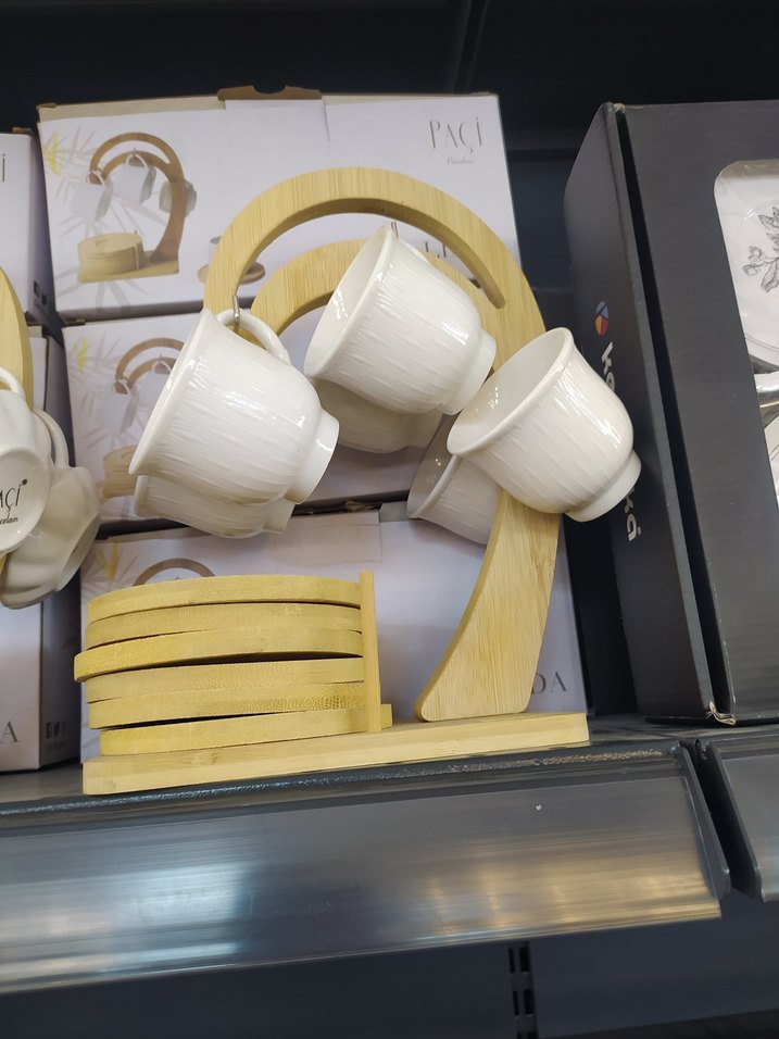 Ahşap stand üzerinde 4 beyaz porselen fincan ve altlıklarından oluşan sade tasarımlı set. ☕