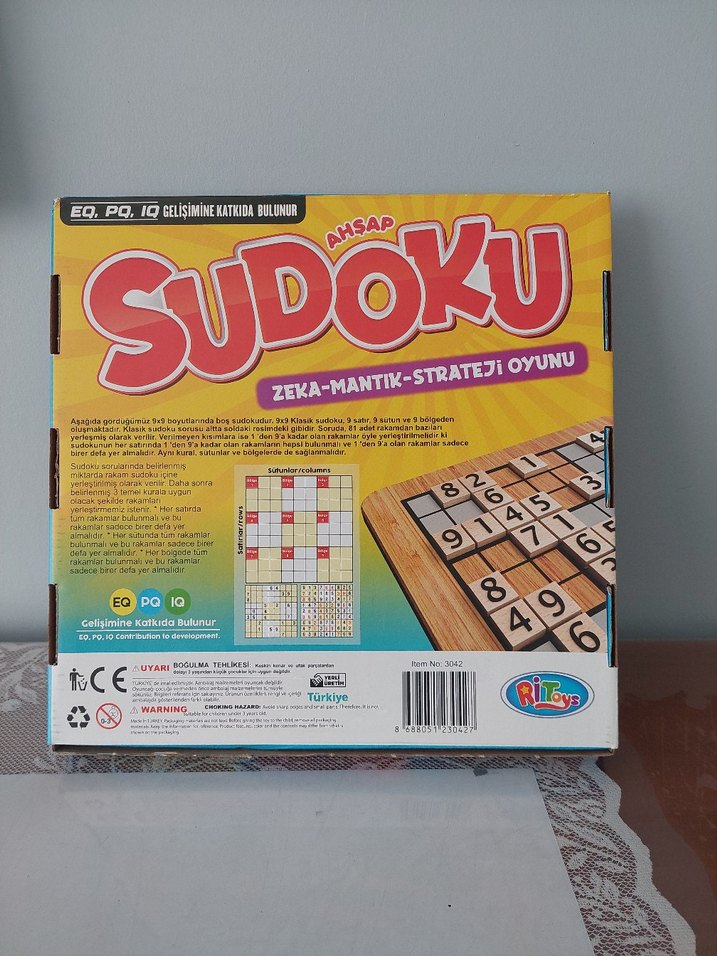Zeka-Mantık strateji oyunudur.EQ,PQ ve IQ gelişimine katkıda bulunur.Elinizdeki sudoku 9x9 -3x3lük alt bölümmerden oluşan ahşap malzemeden üretilen bir zeka oyunudur.Sudoku sorularında belirlenmiş miktarda rakam sudoku içine yerleştirilmiş olarak verilir.Daha sonra 3 temel kurala uygun olacak şekilde rakamları yerleştirmeniz istenir,1. Kural:Her satırda tüm rakamlar bulunmalı ve bu rakamlar sadece birer defa yer almalıdır.2. Kural:Her sütunda tüm rakamlar bulunmalı ve bu rakamlar sadece birer defa yer almalıdır.4. Kural: Her bölgede bütün rakamlar sadece birer defa bulunmalıdır.Oyun başlama senoryaları kitapçığında çocuklar ve yeni başlayanlar olmak üzere orta,zor ve uzman senoryaları bulunmaktadır.Hadi ne duruyorsunuz alın ve ailecek başlayın...Size bir ipucu ama sakön kimseye söylemeyin, Ahşap tahtanın arka tarafı boş yani satranç ve dama çizgileri çizerek farklı oyunlar için de değerlendirebilirsiniz.Şimdiden iyi eğlenceler....