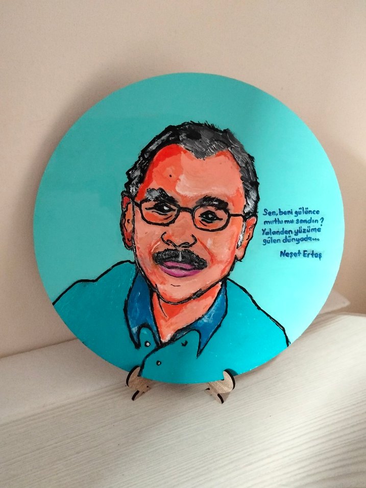 Ahşap supla üzerine 25*25cm boyutunda akrilik boyayla karikatür tarzında Neşet Ertaş çizimi Kesin almak isteyen olursa bilgi alabilir indirim uygulaması yapacağım