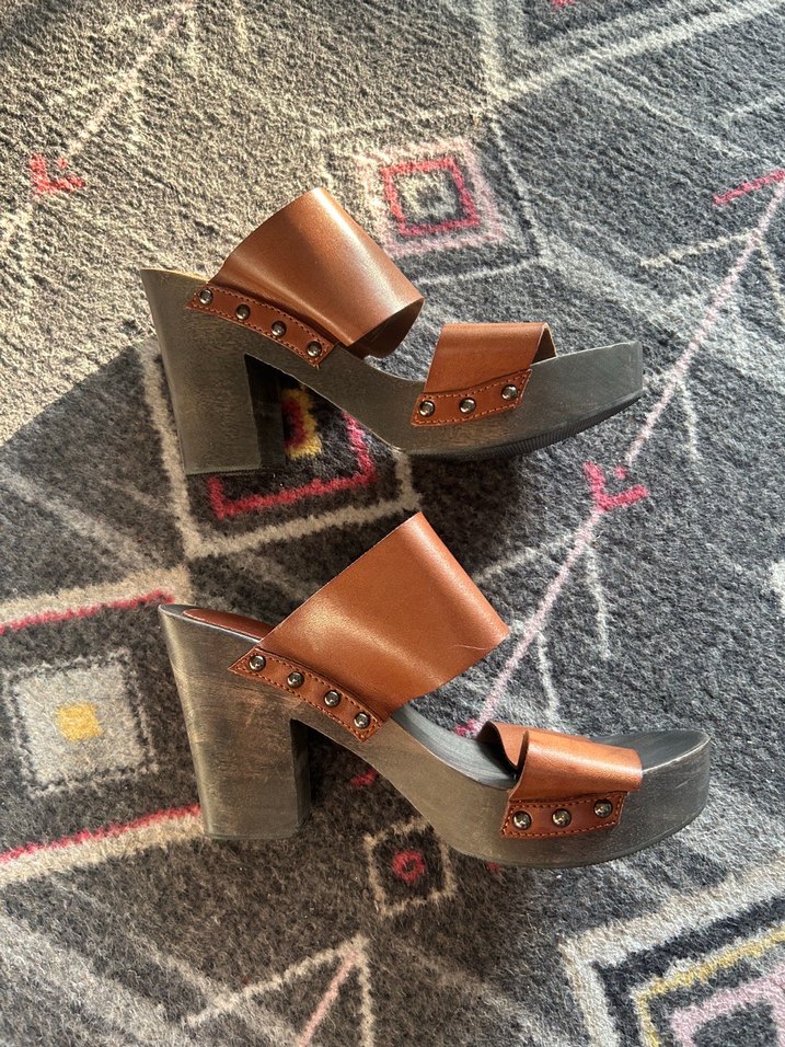 Tahta topuklu deri terlik. Bant kısmı deri ve yıpranmamıştır. İç kısmında ufak bir soyulma olmuş o kısım deri değil çünkü. Asla kullanıma engel değildir çünkü tabanda, içte kalıyor.Tahta olmasından dolayı ve bant kısımları deri olduğundan aşırı rahattır. Dışarda sadece 1 kez giyilmiştir. Sorunsuzdur. Markası LCW ve deridir.