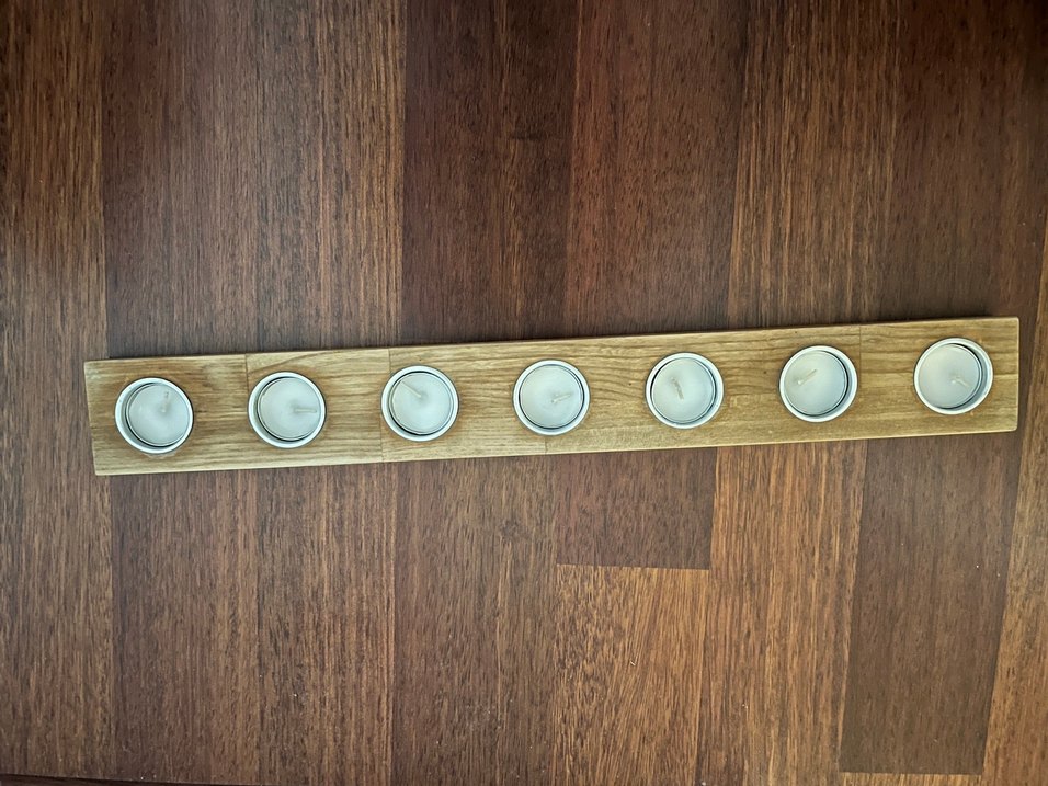 Bej renkli ve ahşap tabanlı, üzerinde yedi adet açık renk mum bulunan mumluk ️.