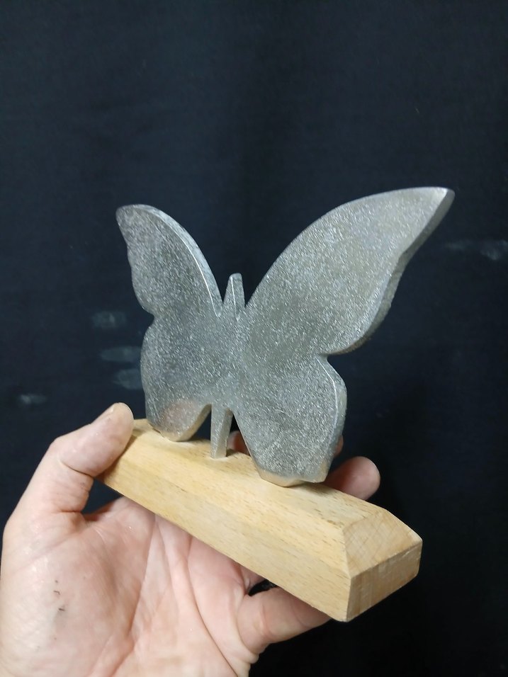 Dokulu gri kelebek figürü ahşap taban üzerine yerleştirilmiştir. Basit ve doğal bir tasarıma sahiptir.