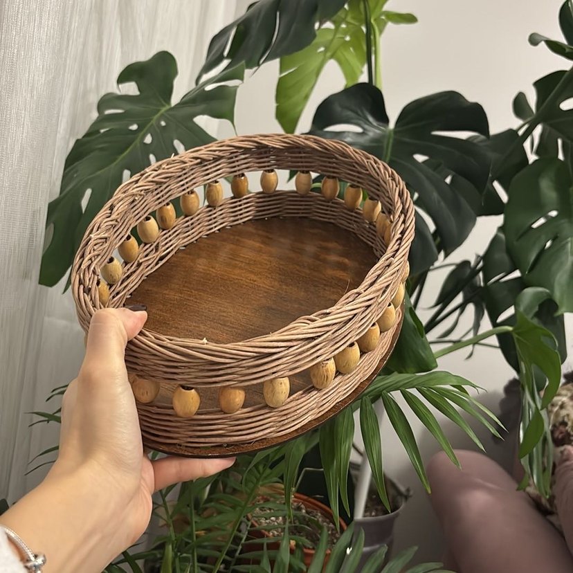 Ahşap tabanlı, çevresinde ahşap boncuk detaylı bej renkli hasır rattan sepet tek fiyattır