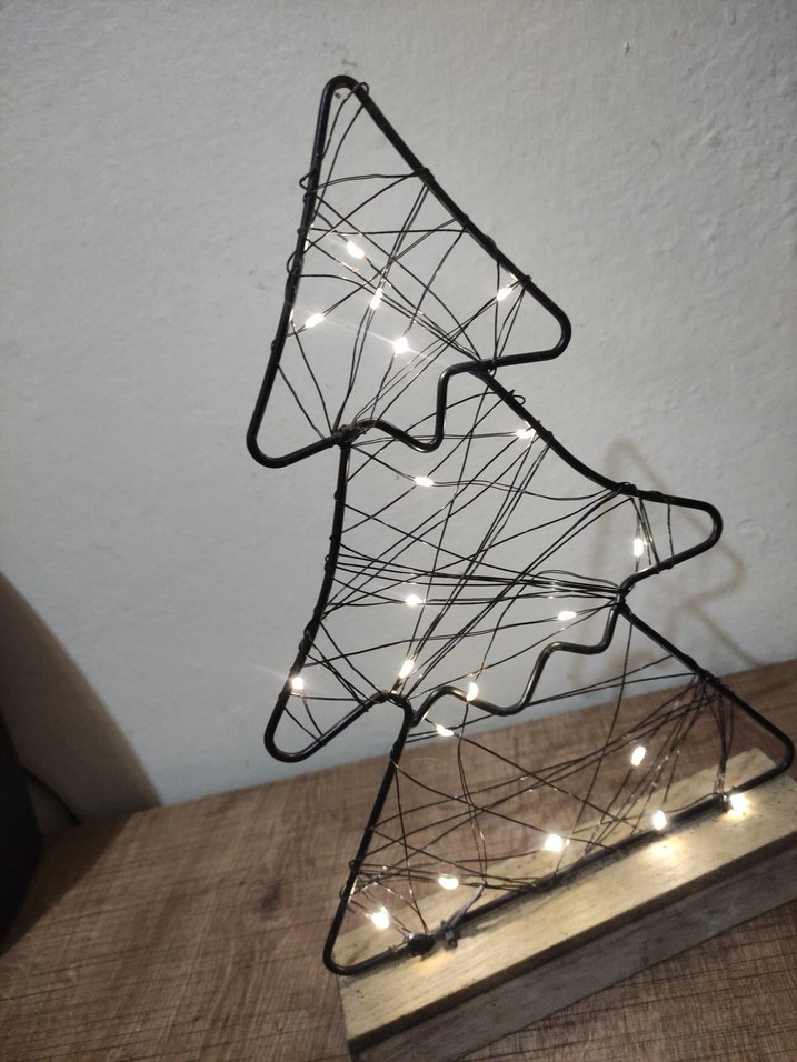 Ahşap taban üzerinde, kahverengi telden yapılmış ve ışıklarla sarılmış dekoratif ağaç, sıcak bir atmosfer yaratır.