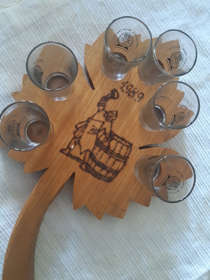 Altı ahşap shot bardağı, yaprak şeklinde ahşap tepside, fıçıcı figürü detaylı sıfır