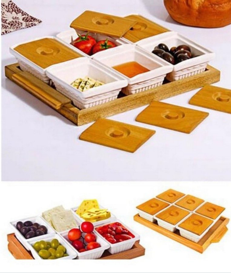 Ahşap kapaklı beyaz saklama kapları ve tepsi seti, yiyecekleri düzenlemek ve sunmak için uygun. ️Hiç kullanılmadı.