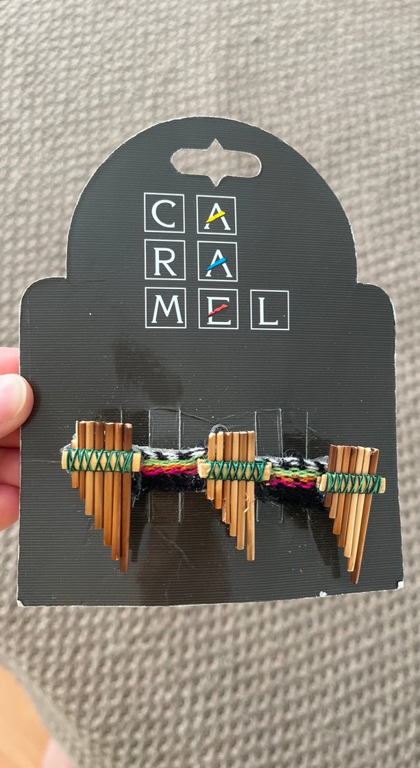 Koyu camel ahşap renkte, canlı renkli iplerle süslenmiş küçük bir pan flüt müzikal tarzı kompakt boyuttadır. Arkası geçirip takılmalı
