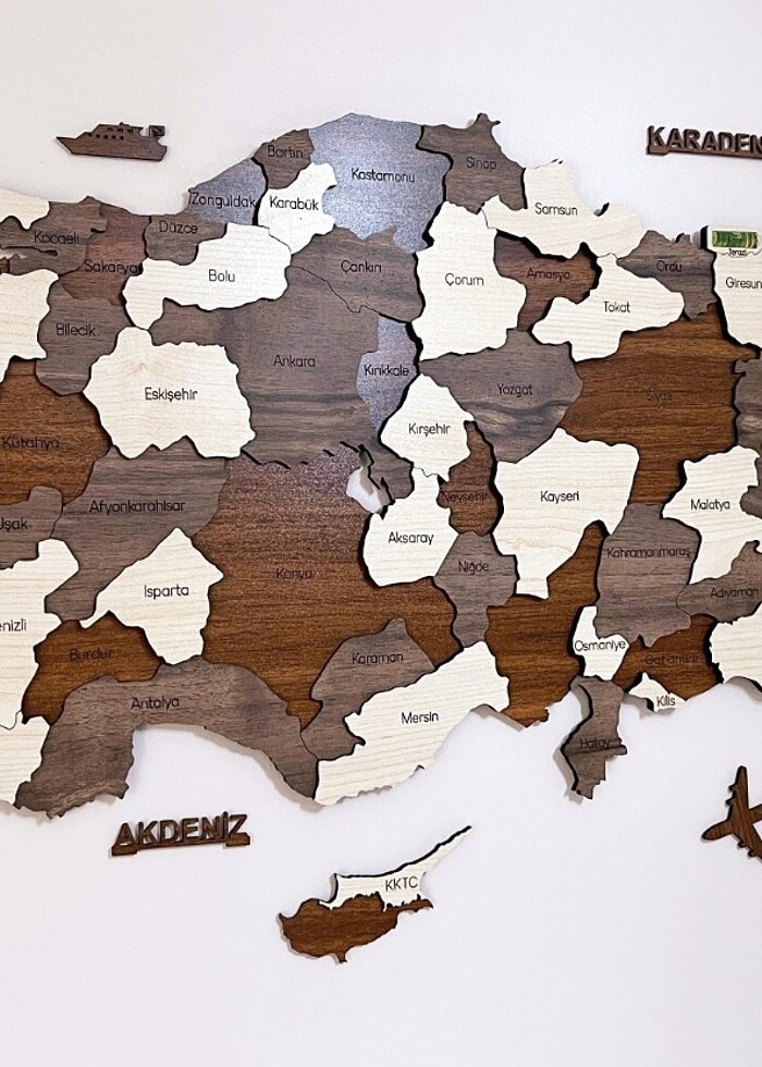 El işçiliği ile birleştirilmiş, 3mm MDF ahşaptan lazer kesim ile üretilmiş 3 katmanlı Türkiye Haritası. Ana harita 90x40 cm ölçülerindedir. Kıbrıs adasıyla beraber yüksekliği 48 cm olmaktadır. Arkasındaki aparat ile asılabilir veya çift taraflı köpük bantlar ile yapıştırılabilir. Ana harita dışındaki Kıbrıs adası, deniz isimleri ve çevre süsleri yalnızca arkalarındaki köpük bantlar ile yapıştırılabilir formattadır. Titiz el işçiliğiyle bir araya getirilmiştir. Tek tasarımım olduğu için ekstra özen gösterilmiştir. Kalitesine ve detaylarına hayran kalacağınıza eminim. Özel kutusu ile güvenli bir şekilde kargolanmaya uygundur. Şık tasarımı ile ofislerinize, evinize, çalışma alanlarınıza tarz katar. Hediye etmek için mükemmel bir tercihtir.