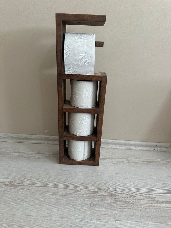 Doğal ahşap malzemeden yapılmış, çoklu tuvalet kağıdı rulolarını dikey olarak saklayan düzenleyici.