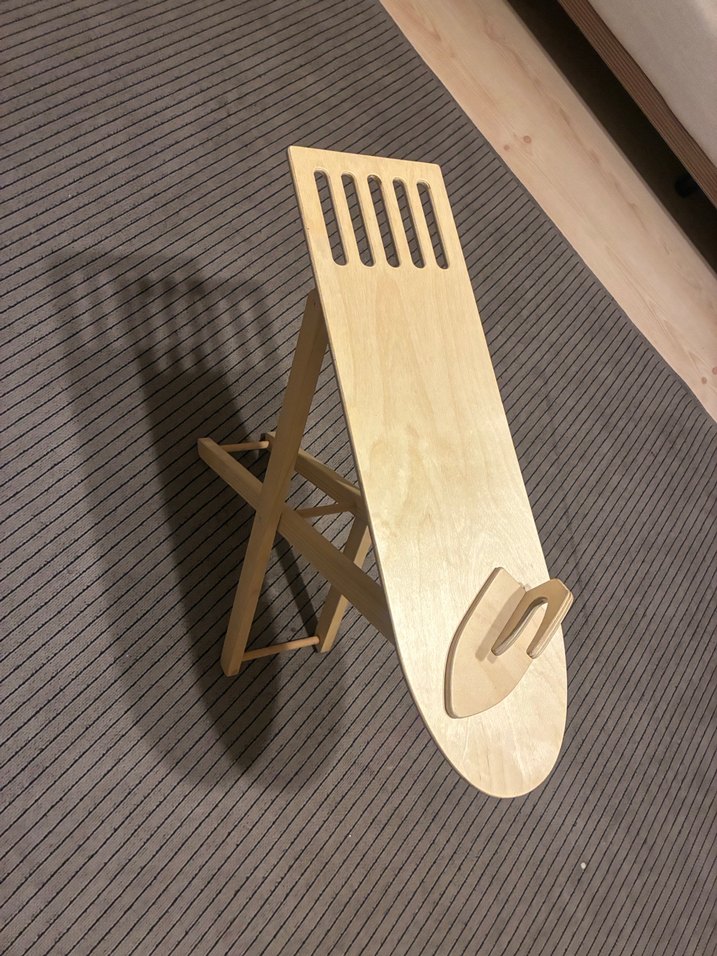 Kahverengi ahşaptan yapılmış, katlanabilir tasarımlı ütü ve masası.