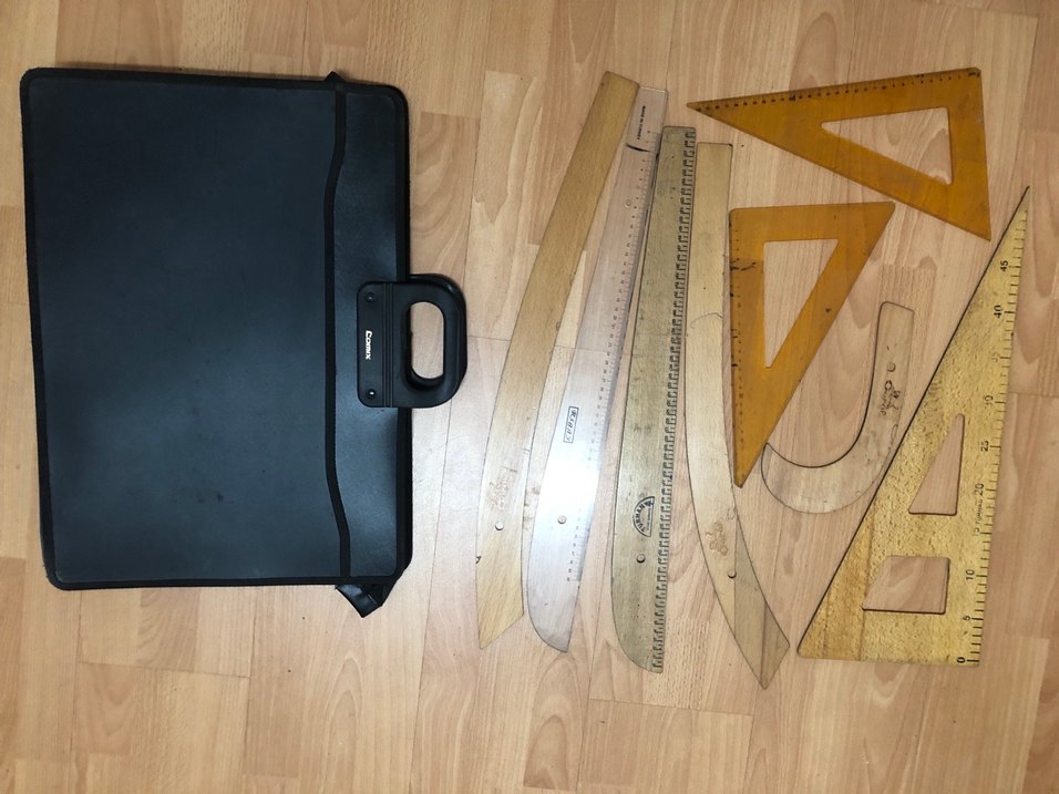 Farklı şekillerde ahşap ve plastik cetvellerden oluşan set, siyah taşıma çantası ile birlikte. Okul etkinlikleri için uygun.