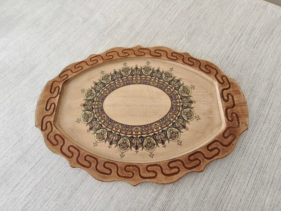 İleri dönüşüm bilinciyle ve daha estetik duruş kazandırmak amacı ile eskitme tarzında yeniden boyanmıştır. Soft ve her dekorasyona uyum sağlayacak kaliteli bej boya ile renklendirilmiştir.Detayların ortaya çıkması ve vintage bir hava katması için eskitme kremi ve jeli uygulanıp transferle dekor oluşturulmuştur. Tepsinin arkasına ağaç dokusu görüntü verilmiştir. Fabrikasyon değildir; bu nedenle el işçiliğinin getirdiği doğal geçişler ve özgün dokular hakimdir. Vernikleme işlemi yapıldığı için boyasında kalkma veya solma olmaz. Şık sunumlar veya Country tarzı dekorasyon severler için idealdir. Bu hali ile İlk kullanan siz olacaksınız. Ölçüleri: 47x32 cm