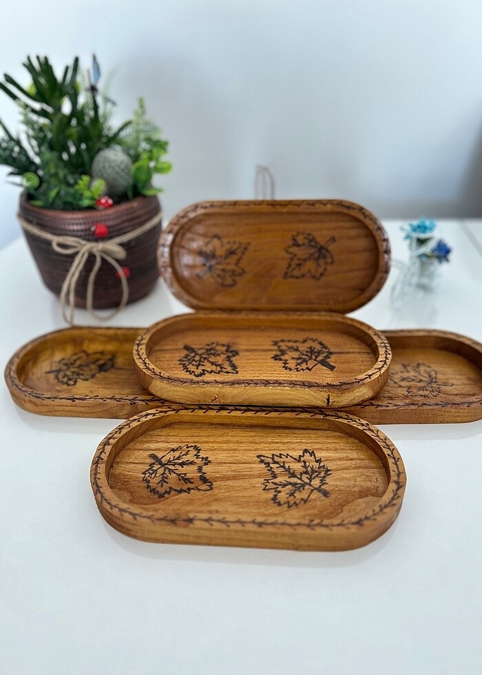 6 adet ahşap sunumluk. 5 adeti yaprak desenli diğeri farklı desen. Adet fiyatı 100 tl.