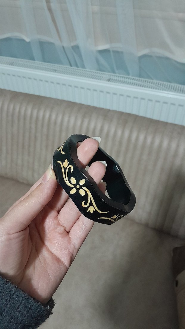 Siyah renkte, ahsap yapılı ve çiçek desenli kadın bilekliği. Günlük kullanıma uygun, vintage tarzda klasik bir aksesuar.
