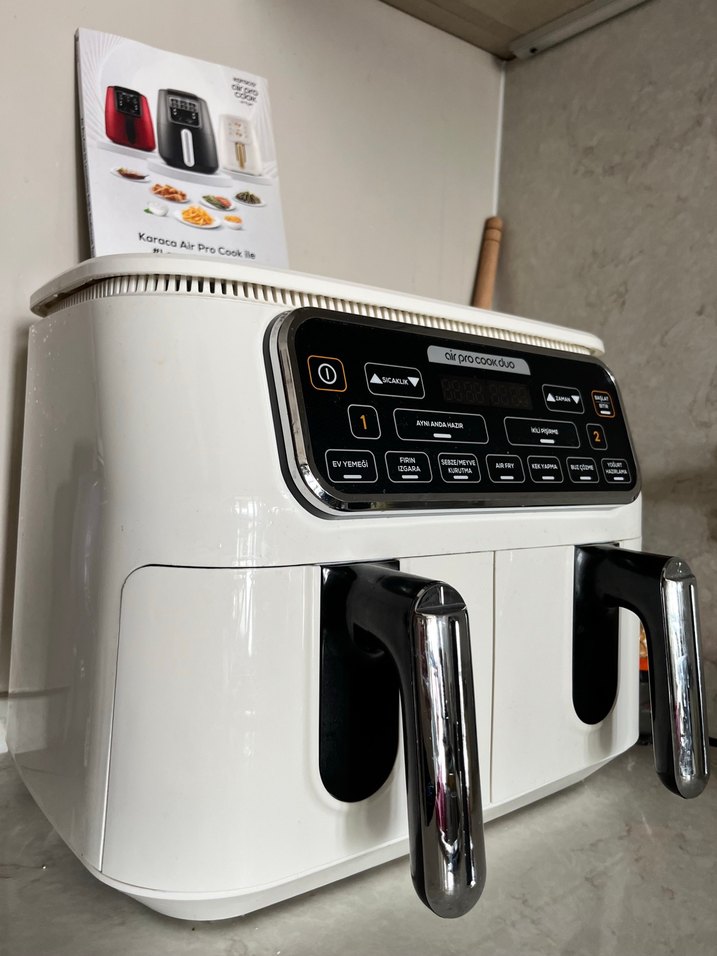 Beyaz dijital hava fritözü, çoklu pişirme ayarları ve kolay kullanım için krom saplı iki çıkarılabilir sepet içerir.