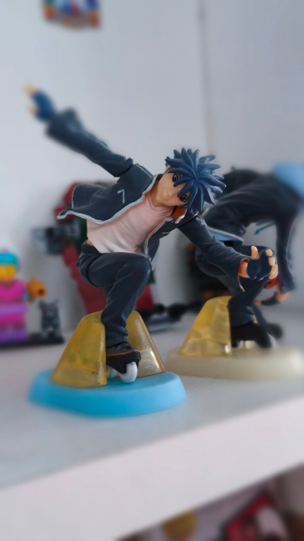 Mavi saçlı, koyu renk kıyafetli bu aksiyon figürü, mavi taban ve sarı desteklerle dinamik bir pozda duruyor. Koleksiyon için uygun.
