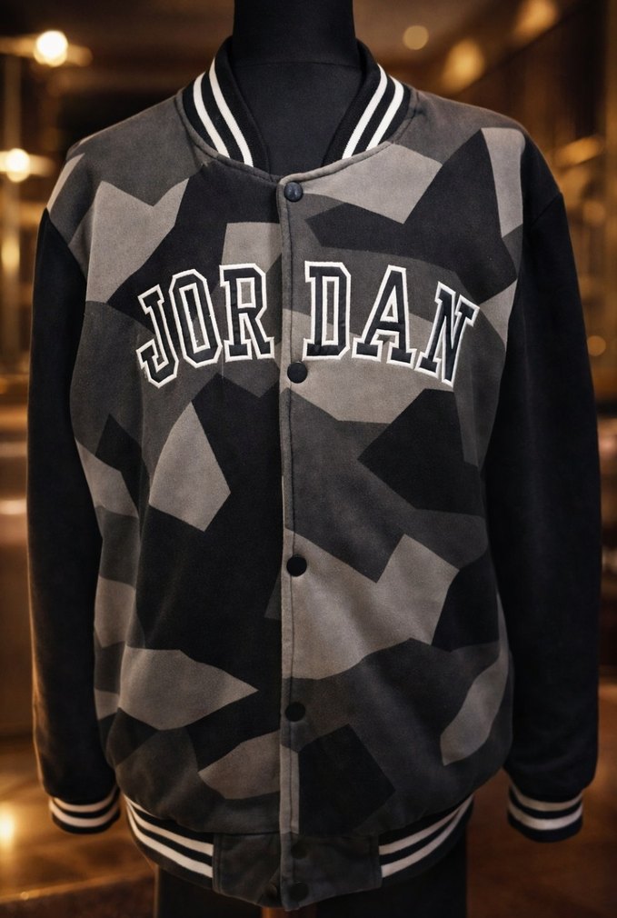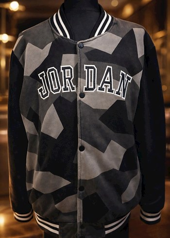 Erkek çocuk için gri kamuflaj desenli, düğmeli, bol kesim ceket. Önünde "JORDAN" yazısı ve bisiklet yaka bulunur. Rahat sokak tarzı için uygun.