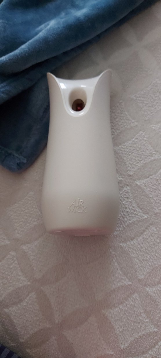 Air Wick otomatik oda spreyi, kesintisiz koku yaymak için şık beyaz tasarıma sahiptir.