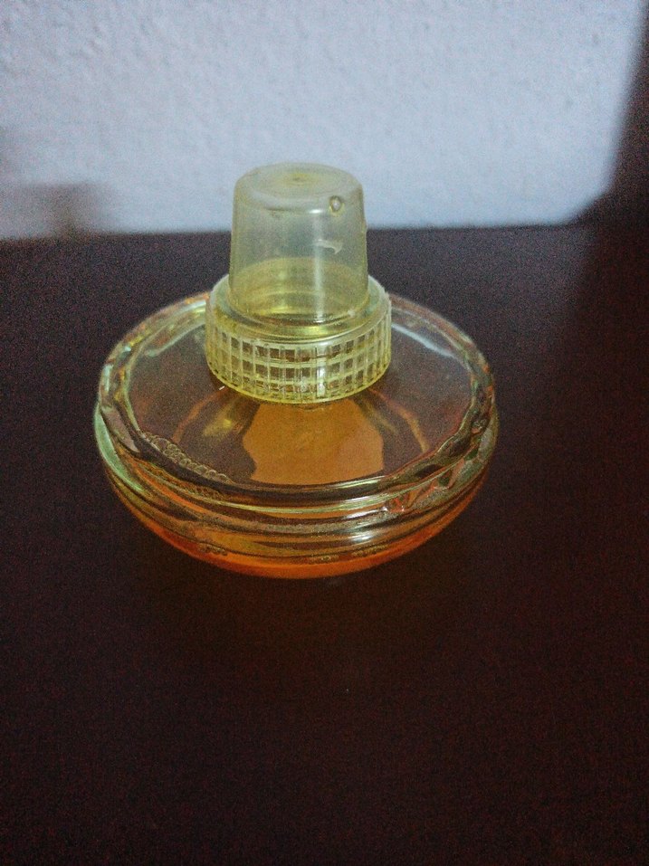 Yuvarlak cam şişede, sarı kapaklı kadın parfümü, içi amber renkli sıvı ile dolu.