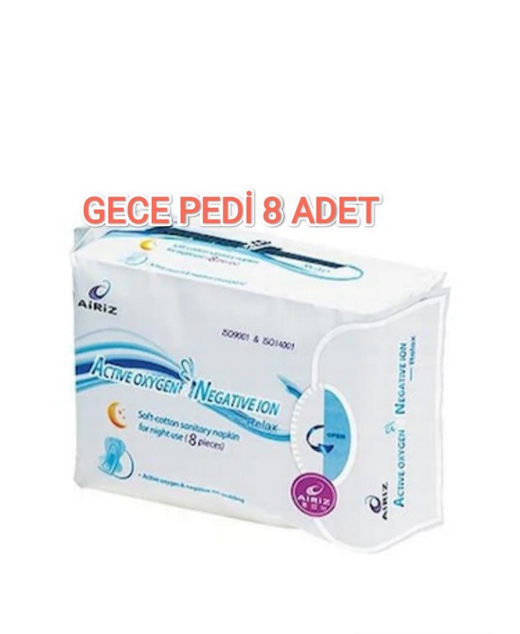 AiRiZ yumuşak pamuklu hijyenik pedler, gece kullanımı için aktif oksijen ve negatif iyon dolgulu, 8 adet içerir.