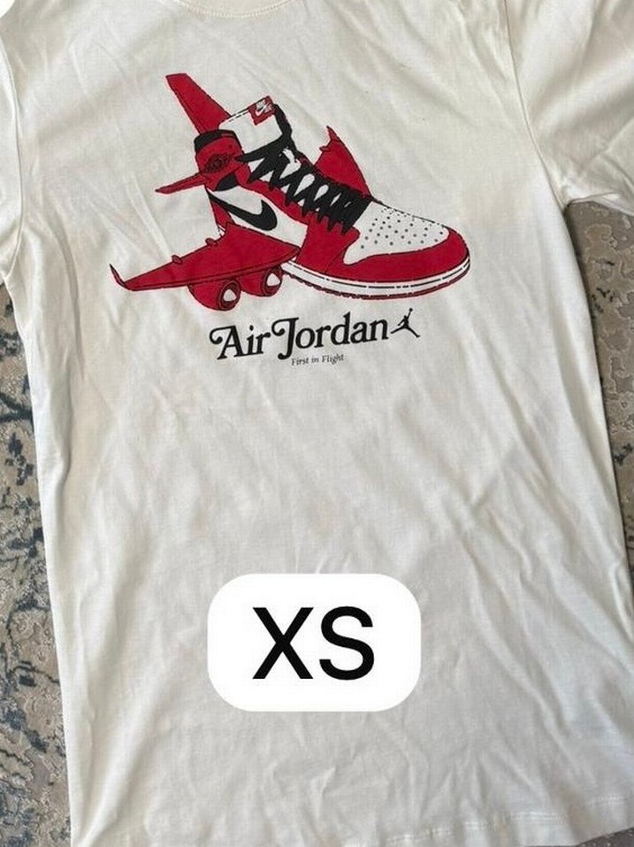 Pamuklu beyaz erkek tişört, bol kesim ve kısa kollu. Önünde AirJordan baskılı sneaker deseni bulunur, XS beden.