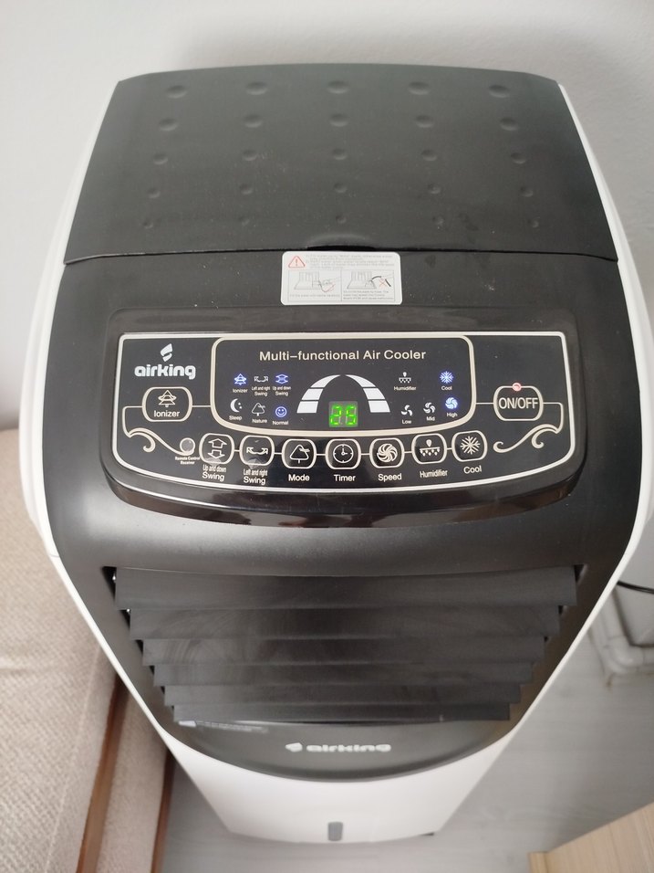 Airking çok fonksiyonlu hava soğutucu, iyonizer, ayarlanabilir hız, zamanlayıcı ve nemlendirici özelliklerine sahiptir. Beyaz ve koyu renk tasarımda, kolay kullanım düğmeleri bulunur. ❄️