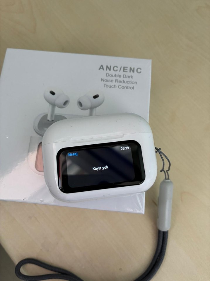 Aktif gürültü engelleme (ANC/ENC) ve dokunmatik kontrol özellikli beyaz kablosuz kulaklık. Ekranda 'Kayıt yok' mesajı bulunuyor.